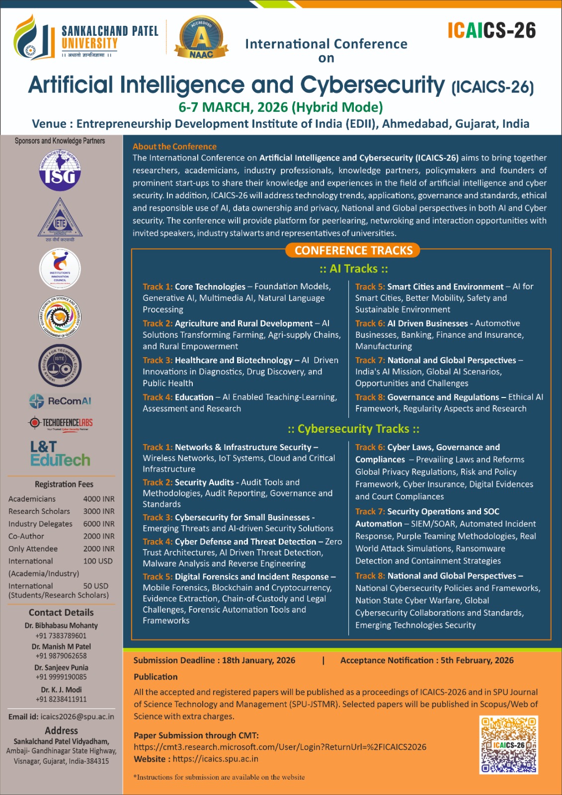 Quality and original contributions from research scholars, faculty of colleges, PG students and Industries, describing their original, unpublished, research contribution which is not currently under review/published by any other conference or journal and addressing state-of-the-art research are invited in the field of AI & Cybersecurity. "International Conference on Artificial Intelligence & Cybersecurity 2026 (ICAICS 2026)" organized by Sankalchand Patel College of Engineering, Sankalchand Patel University Visnagar, Gujarat, India 06th and 07th March, 2026. The Microsoft CMT service was used for managing the peer-reviewing process for this conference. This service was provided for free by Microsoft and they bore all expenses, including costs for Azure cloud services as well as for software development and support.